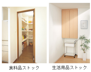 保存食料やペットボトルの飲料水など、3日分の食料品を収納できる「食料品ストック」を、キッチン周りに設けました。平常時からローリングストック法(※3)を取り入れることで、無駄なく食料を備蓄できます。 また、卓上コンロやガスボンベなどの燃料や、洗面用具・トイレットペーパーなどの日用品、最低限の衣類などを収納できる「生活用品ストック」を階段下スペースなどに設けました。 |