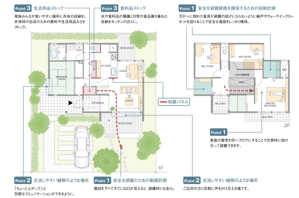 3.緊急時の避難動線など「安全・安心」に暮らせるプランニング 「xevo KⅡ~絆~」は、将来の家族構成やライフステージの変化に柔軟に対応でき、何世代にも亘って住み継ぐことができる自由設計戸建住宅です。また、非常時にも安全・安心に行動できるよう、細やかな配慮を施したプランニングを提案します。