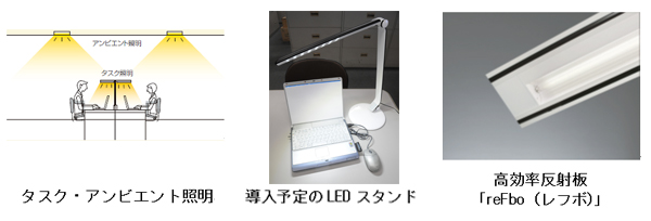 4.タスク・アンビエント照明の導入 これまでのオフィスは、天井に設置された照明器具により、空間全体で照度を確保する照明計画が主流でしたが、昨今のオフィスでは、天井照明(アンビエント照明)の照度を控えめにし、作業用照明(タスク照明)で必要な照度を確保する「タスク・アンビエント照明」の導入が進んでいます。 そこで、当社でも今回の節電要請を受け、照明の省エネ手法として有効とされる「タスク・アンビエント照明」を導入します。 東北電力・東京電力・関西電力管内の事務所には、タスク照明として約5,000台のLEDスタンドを導入し、アンビエント照明となる天井照明の蛍光灯を3分の2程度間引いた、省エネのワークスタイルを実践します。