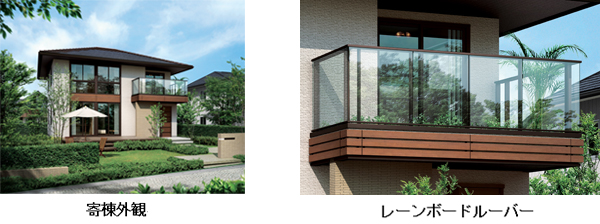 ■外観デザイン 「xevo Li」では、シンプルなシルエットを基本とし、深い軒下をもつバルコニーや、多くの光と風を取り入れられる大きな開口、アクセントとなる木調のレーンボードルーバーなどにより、環境との調和に配慮した外観デザインを提案します。