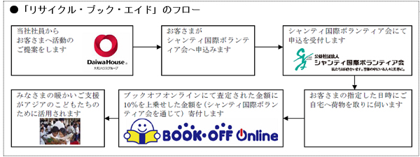 「リサイクル・ブック・エイド」とは、お客さまのご自宅の引越しや事務所移転の際に、不要になった本やCD、DVDなどをブックオフオンラインにて査定し、その査定額に10%を上乗せした金額を、シャンティ国際ボランティア会を通じて寄付し、貧困や教材不足から教育を受けられないアジアの子どもたちを支援する活動です。 当社の新築住宅等を建てられたお客さまが引越しの際に、不用品を処分される機会があります。その際、当社では当活動を紹介して、お客さまの参加を促します。 今後は、名古屋支社など、11事業所において「リサイクル・ブック・エイド」を開始し、2012年4月より、全国展開していきます。