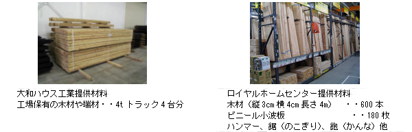 大和ハウス工業株式會社(本社:大阪市、社長:大野直竹)とロイヤルホームセンター株式會社(本社:大阪市、社長:田村哲哉)は、2012年12月6日、東日本大震災において被災された、宮城県多賀城市內の仮設住宅(6ヵ所)の入居者に対して、日曜大工の材料となる木材や端材と、鋸(のこぎり)や鉋(かんな)などの工具を無償で提供します。