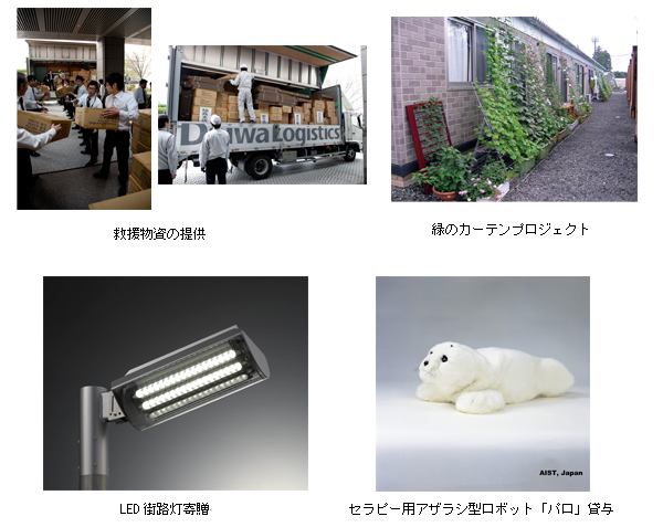 當社ではこれまで、東日本大震災で被災された方々の支援のため、義援金の寄付や救援物資の提供、LED街路燈の寄贈、セラピー用アザラシ型ロボット「パロ」の無償貸與等を行ってきました。また、2011年5月より、NPO法人「緑のカーテン応援団」とともに、仮設住宅の快適さ向上のため、アサガオやゴーヤ、ヘチマなどによる緑化を行う「緑のカーテンプロジェクト」を進めてきました。