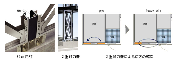 (1)80mm角柱と2重耐力壁の採用によりプラン自由度を拡大 「xevo 03」では、1階の柱幅をこれまでの60mmタイプから80mmタイプに変更したことにより、従来の当社3階建と比べて約2割耐力が向上しました。室内の柱や壁が減るため、自由にプランニングをすることができます。 また、1階外壁部を2重耐力壁にすることで、間口が狭い建物であっても開口部を大きく確保することができます。