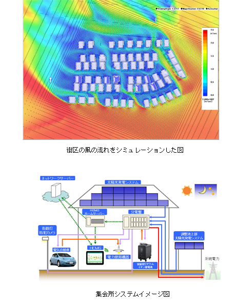 (1)街づくりでの取り組み 街区計画では、地域の風況を考慮し、隣接する里山の冷気を取り入れて住戸内へ導くなど、自然環境を上手に利用するパッシブデザインとしました。 集会所には、太陽光発電システムと大型リチウムイオン蓄電池を設置し、共用部エネルギーの自給自足を目指します。 集会場で発電する電力を電気自動車の充電に利用し、非常時には電気自動車から共用施設へ電力供給を行うこともできます。 また、電線類の地中化を行い、街路景観にも配慮します。