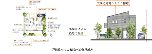 (2)住宅における取り組み 全ての住戸を次世代省エネルギー基準Ⅲ地域(※3)の高断熱仕様とし、太陽光発電システムやLED照明、高効率給湯器もしくは燃料電池を採用することで、ZEHを実現します。 また、全住戸に家庭用リチウムイオン蓄電池を搭載し、HEMS(※4)で制御することで、電力消費のピークシフトを実現します。経済メリットが出るよう、電力をどの時間帯に充電し、いつ放電するかをコントロールします。 外構造園計画では、植栽を効果的に配置することで、上手に日陰をつくるパッシブ設計も行います。 ※3.住宅性能表示制度において定められている地域区分。大阪府はⅣ地域の区分。Ⅲ地域は宮城県などのエリア。 ※4.ICT 技術の活用により、住宅のエネルギー管理などをするシステムのこと。