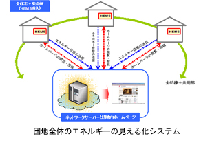 (3)マネジメントへの取り組み 団地内専用のホームページを開設し、各戸のHEMSからデータを集計して、団地全体のエネルギー状況の見える化を行うとともに、コミュニティ形成に役立つ情報を提供します。 ホームページ内では、住戸毎に省エネルギー貢献度のランキングを表示し、貢献度が高い住宅には団地内エコポイントを付与します。ポイントは、団地内で実施するカーシェアリング利用の際に使用することができます。