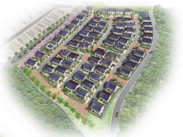 ●採択された提案内容 本事業は、大阪府堺市泉北ニュータウン内の小学校跡地で進める一団の分譲住宅において、開発計画から住宅・外構計画、販売後のサポートまで一貫して、エネルギー消費量やCO2排出量の削減をめざした「街づくり」「住宅」「マネジメント」「管理組合」「普及」の5つの取り組みを行います。 当社試算(※2)によると、住宅65戸と共用施設(集会所・地下式の調整池の地上部)での年間のエネルギー創出量は、住宅約75戸と共用施設のエネルギー消費量に相当し、街全体の年間のエネルギー消費量を正味(ネット)でゼロにすることができます。(ネット・ゼロ・エネルギー・タウン達成率114.85%、住宅約10戸分のエネルギーを団地外に供給可能)節電と電力不足の解消に貢献するとともに、CO2排出量の削減にも寄与します。 ※2.1戸あたり年間のエネルギー消費量を約57GJ、エネルギー創出量を約65GJ、街全体のエネルギー余剰量を約570GJとして試算。GJとはエネルギーの単位。ギガジュールのこと。