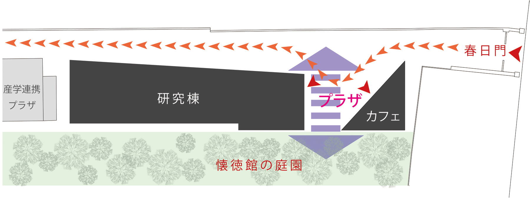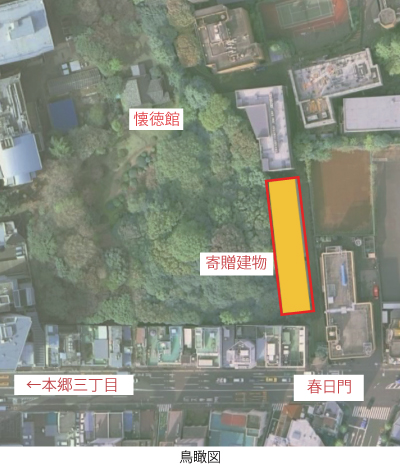 1.交流拠點を創り出すキャンパスの新しい「ゲートビルディング」 本館は、本郷三丁目交差點に程近く利用者の多い春日門と一體となった本郷キャンパスの新しい「ゲートビルディング」です。 春日門から構內へと続く通路と隣接するプラザは懐徳館の庭園を借景とする、キャンパスの新しい交流拠點となります。