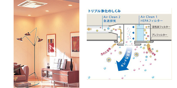 1.PM2.5や花粉、ハウスダスト等を除去する空気清浄ユニット『換気浄化「ef」』を標準搭載 リニューアル発売する「xevo E」は、室內空気質の向上を図るため、従來の24時間換気システムに加え、當社オリジナルの空気清浄ユニット『換気浄化「ef」』を標準搭載しました。 室內の空気をセンサーで常にチェックし、汚れ具合に応じて自動運転します。また、クリーンルームなどで使用されている高性能なフィルター「HEPAフィルター」によって、アレルギーの原因になりやすいハウスダスト、花粉やPM2.5に含まれる0.3μmの微粒子を99.97%以上除去します。さらに、急速排気機能によりペットの臭い等を屋外に排出し、室內の空気質を向上させます。 この「フィルター?急速排気?プラズマクラスターイオン」のトリプル浄化機能は、市販の空気清浄機ではできないハウスメーカーならではの機能です。また、天井カセット式なので、すっきりと設置でき、置き場所に困ることがありません。