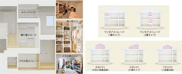 2.家のデッドスペースを有効活用できる「おまもり収納」を提案 當商品は、収納スペースが不足した場合でも、家の規模を大きくせずに、家のデッドスペースや空間を立體的に活用できる「おまもり収納」を採用したことで、アルバム等の思い出の品を捨てずに守ることができます。 階段の「踴り場クローク」や「踴り場クローク」下の「メガ土間ストレージ」、1層タイプの「ワンモアストレージ」、大型小屋裏収納「ギガロフト」など多種多様な「おまもり収納」を提案します。