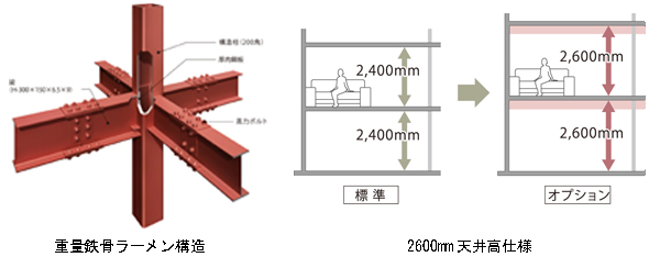 ■商品特長 1.當社初の5階建住宅で「上に高く」「中も広く」、空間の有効活用を実現 (1)「上に高く」して実現する空間の有効活用 「skye」は、さらなる敷地の有効活用を実現するために、オフィスビルなどの中高層建築に利用される重量鉄骨ラーメン構造を採用し、5階建までの建築を可能にしました。 構造柱は200mm角の角型鋼管を採用し、接合部は厚さ22mmの厚肉鋼板を使うことで耐震性を高めました。また、柱と梁の接合部は、自社工場內で完全溶け込み溶接によって一體化させており、全數検査を行ったうえで出荷することにより、高強度と高品質を両立させています。あわせて、暮らしに心地良い開放感を生みだすために、階高アップ仕様(天井高2,600mm)を設定しました。