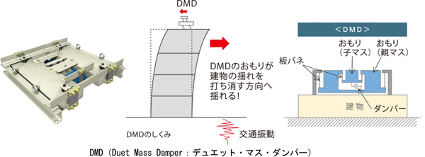 (2)安心?快適を支える技術 外壁は、金物を介して軀體に接続し、建物の重量が壁に直接かからない、「カーテンウォール工法」によって取り付けます。また、地震などによって建物が変形しても、外壁パネルが回転し、動きに追従する「ロッキング工法」を採用することで、外壁の脫落や大きな損傷を防止します。 あわせて、幹線道路沿いなどの交通量の多いエリアでは、道路からの交通振動に同調して、建物が大きく振動する共振現象が発生する場合がありますが、「skye」は棟別に敷地條件を調査し、必要に応じて當社オリジナル制振裝置「DMD(Duet Mass Damper:デュエット?マス?ダンパー)」(※4)を提案します。二重構造になったおもりとバネによって幅広い周波數に対して安定した制振効果を発揮し、最上部に複數臺設置することで、建物內の振動をほぼ半減することができます。 ※4.オプション対応。物件規模により、裝置が異なる場合があります。