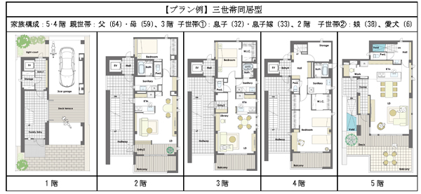 3.多世帯同居型、賃貸併用、店舗併用など多様なニーズに対応 「skye」は、5階建の多層階利用と重量鉄骨ラーメン構造による無駄のない空間利用により、敷地的な制約で実現しづらかった多様な住まい方提案が可能になります。 より広い床面積が必要とされる三世帯同居型住宅でも、4?5階建であれば、限られた敷地のなかで、各世帯のプライベート空間をしっかりと確保することができます。 また、専用住居スペースを確保しながらも、下層階に賃貸住宅や店舗を併設することで、新たに用地を取得しなくても不動産経営を行えたり、職住一體のライフスタイルが可能になったりと、土地の持つ資産価値をさらに活用することができます。