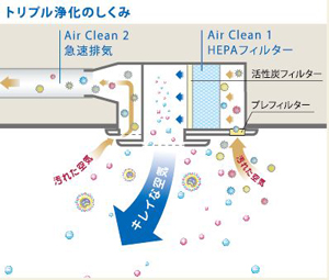 「空気清浄機」?「換気」?「イオン発生器」の技術を備えたトリプル浄化機能 1.住宅業界で初めて搭載した高性能「HEPAフィルター」 活性炭フィルター、プレフィルターに加え、住宅業界で初めて高性能「HEPAフィルター」を搭載しました。高い洗浄度が要求される病院の集中治療室やクリーンルームでも使われている高性能「HEPAフィルター」が、タバコの煙に相當する0.3μmの非常に細かい粒子でも99.97%以上除去します。