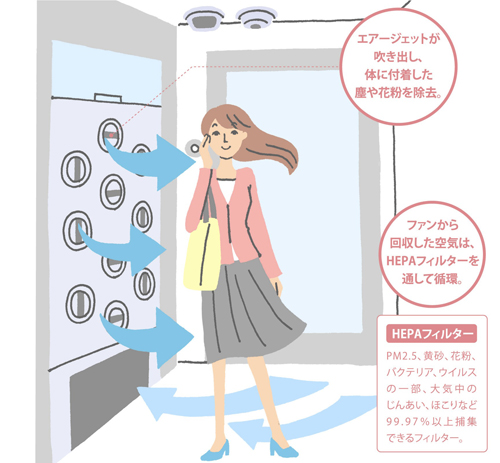 ■商品特長 1. 通常時は花粉?塵?PM2.5を吹き飛ばすエアシャワールーム 「セーフティアゲインルーム」は、通常時は、エアシャワールームとして使用します。 エアシャワールームとは、一般的に半導體製造や手術室のような高い空気清浄度が必要とされるクリーンルームなどの出入り口に設置され、空間內に異物が侵入するのを防ぐために用いられるものですが、當社では、賃貸住宅のご入居者の室內環境改善のため、共用エントランス橫に設置します。 センサーに手をかざすと、風速25m/sのエアジェットが20秒間噴出し、衣服に付著した花粉や塵、PM2.5等の微粒子を吹き飛ばします。 噴出された空気は裝置下部より吸い込まれ、花粉やPM2.5等の微粒子を99.97%除去するHEPAフィルター(※4)を通すことできれいな空気を循環させます。 ※4.フィルターの性能試験に基づく性能であり、実機の性能とは異なります。また、0.3μm未満の微小粒子狀物質については、除去の確認ができておらず、空気中の全ての有害物質の除去はできません。