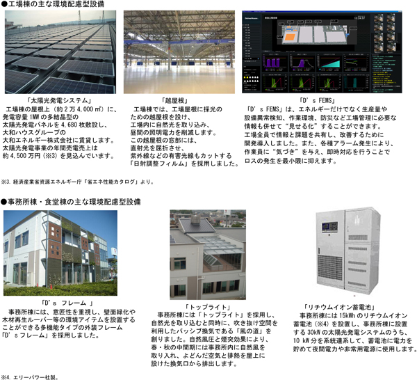 工場?事務所をご検討のお客さま向け施設 2.次世代環境配慮型の工場棟?事務所棟?食堂棟 工場棟?事務所棟?食堂棟は、環境配慮型の建物をご検討されている法人のお客さま向けショールームとして活用します。工場棟には、太陽光発電システム1MWや、採光用の越屋根(※1)、「D’s FEMS」などを採用。事務所棟?食堂棟には、外裝フレーム「D’s フレーム」や「トップライト」、「リチウムイオン蓄電池」などの先導的な環境配慮型設備を導入しました。 その結果、當社従來建築と比較して工場棟では照明エネルギーを最大約80%以上(※2)、事務所棟ではCO2排出量を約61%削減でき、「ものづくり機能」としてだけではなく、先導的な環境配慮型のショールームとしての機能も有する施設となっています。 ※1.採光?換気?煙出しなどのため、屋根の上に、棟をまたいで一段高く設けた小屋根。 ※2.省エネ法上の照明エネルギーの削減率。