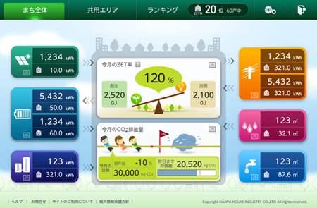 ●街全體のエネルギー見える化の導(dǎo)入 各戸のHEMSからデータを集計(jì)して、街全體のエネルギー狀況の見える化を行います。 また、各戸のエネルギー実績(jī)(省エネ貢獻(xiàn)度)によって、ポイントを付與します。ポイントは、入居者の戸建住宅のメンテナンス等に使用することができます。
