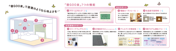 3.住居に関するサービス?システム部門(mén)受賞 (1)「寢GOO楽」 大和ハウス工業(yè)株式會(huì)社 「寢GOO楽」は、大和ハウス工業(yè)と奈良県立醫(yī)科大學(xué)が2006年より「住宅を維持?増進(jìn)させる住宅」の実現(xiàn)に向け、共同研究を行ってきた成果の1つである快眠ルームです。 當(dāng)商品は、アラームクロックにより制御され、お客さまごとの起床時(shí)刻にあわせ部屋の照明を徐々に明るくし、アラームの音とともにカーテンを自動(dòng)で開(kāi)くことができる機(jī)能が付いています。 太陽(yáng)の光や太陽(yáng)の色溫度に近い照明を直に感じることで、體內(nèi)リズムをリセットし、健康な身體を保つことができます。 URL:http://www.upijeej.cn/mansion/naturaleye/project01/index.html