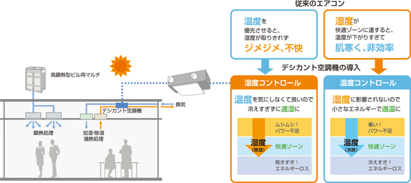 (2)溫度と濕度を制御する「デシカント空調システム」 空気から直接水分を除去?分離して、最適な溫度?濕度の空気を室內に供給するシステム「デシカント空調システム」を採用しました。溫度と濕度を個別に制御することにより、快適な室內環境とランニングコスト削減を実現します。