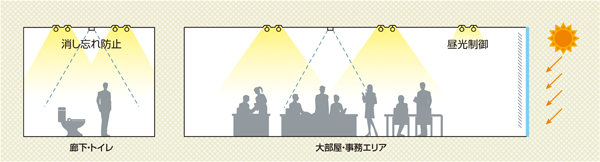 (4)全館LED照明を採用 非常燈など一部の照明を除き、全館LED照明を採用しました。また、事務所內には照度センサー、廊下やトイレ、倉庫には人感センサーを設置、必要な照明のみを點燈させることで、照明電力を削減します。