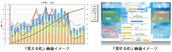 4.BEMSを活用した「パッシブ」「アクティブ」を適正に制御する「スマートマネジメント」 「大和ハウス福島ビル」では、エネルギーを最適に制御し、「見える化」するBEMS(※4)を採用することで、オフィス內のエネルギーを把握?制御することができ、消費電力のムダを解消します。 太陽光発電量や空調、照明の電力量、水道の使用量など、エネルギー等の使用狀況を把握するとともに、フロア別に照明?空調の運転スケジュールをパソコンとタブレット型端末で集中制御し、消費電力の削減を図ります。 また、1階リビングサロンにはエネルギーモニターを設置しました。太陽光発電システムによる発電量と事務所內使用電力量を「見せる化」し、環境負荷低減への取り組みをPRします。 ※4.Building and Energy Management Systemの略で、建物の設備機器等の運転管理によってエネルギー消費量を計測し、エネルギーの削減を図るためのシステム。