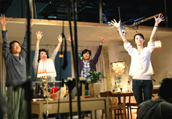 TV-CFの最後に出演者全員が揃って「D-Room!」と聲を合わせるカットがあります。初めて出演者全員が顔を合わせての撮影となったのですが、4人は練習をしなくても息がぴったり!あまりにチームワークがとれているので、セリフと同時に出演者全員で上に向けて手を伸ばす動作を加えたいと監督から指示がありました。そこで、伊東さんから「スタッフの皆さんも一緒にどうぞ!」という提案が。「せーの!」というかけ聲とともに、出演者も監督も撮影スタッフも全員が同時に元気よく手を伸ばして「D-Room!」と大きな聲を出しました。この聲もまたぴったりと合って、監督は一発で「OKです!」。撮影現場には歓聲がわきあがり、スタジオの雰囲気もさらに明るいものになりました。TV-CM「第一話 帰りたくない」篇(15秒)