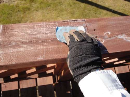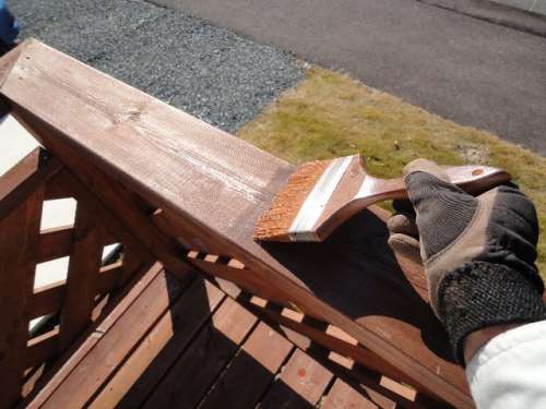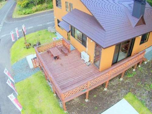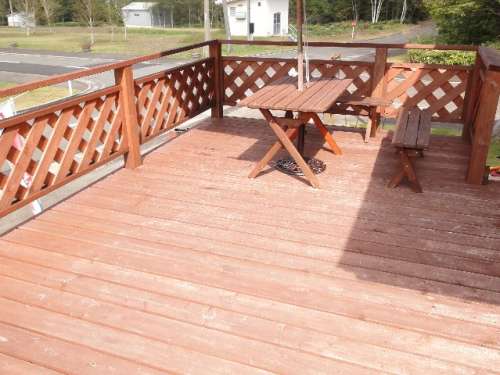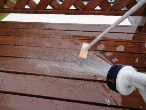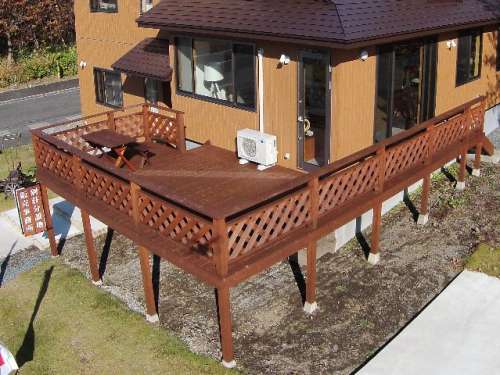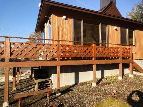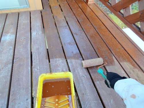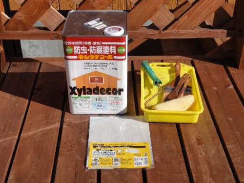 ウッドデッキの塗裝には専用の木材保護塗料『キシラデコール』を使います。通常の塗料が表面に塗膜を作って塗裝面を保護するのに対し、木材にしみ込む事により內部から木材の腐食やカビ、蟲害などを防ぎます