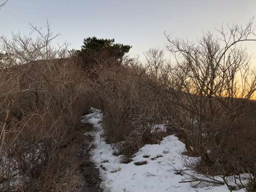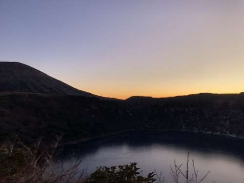 大浪池を超え韓國岳直下の急登に取りつく頃に夜明け。