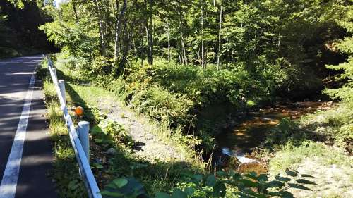 <八幡平リゾートを出たところから見た七時雨山(9月17日撮影)> 七時雨山までは、「七時雨カルデラライン」という道が通っています。名前からある通り、七時雨山はカルデラになっており、この道路もカルデラの中を通過していきます。山に向けて緩やかに上りながらいくつか集落を抜けて行くと、道は森の中に入って行きます。木々に囲まれて木漏れ日の中を走りつつ、道沿いに流れている沢のせせらぎを聞くことができ、気持ち良いです。車でドライブするのもいいんですが、車じゃ沢の音は聞こえないでしょうから、このへんは自転車のいいところです。