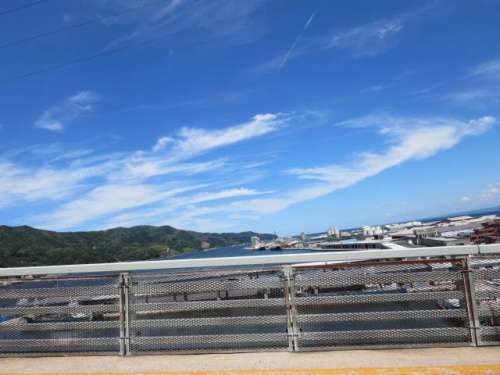 ▲境港の境水道大橋を渡ります。先に見えるは島根半島先端の美保関。