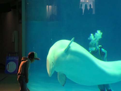 こちらがしまね海洋館アクアス 素敵なデザインのイルカが迎えてくれます 日本海が一望できる展望デッキ シロイルカのショウが始まります。男の子と向き合って??? 『こんにちは~』なんと躾がよくできているのでしょう。