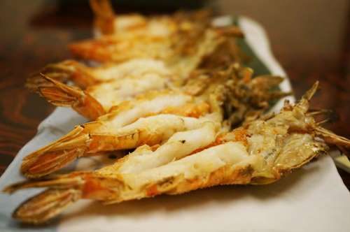 次にモサエビ。身が甘くたいへん風味のあるエビです。鮮度劣化が早いため地元でしか味わえない幻の逸品と言われています。今回はコンガリと焼いて、丸ごと頭からパリパリと頂きます。お酒がすすみます。
