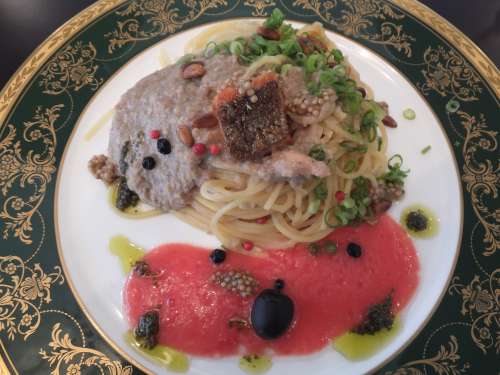 テーブルに運ばれて來た際、ゴージャスな器と、綺麗に盛り付けられたパスタに見とれて 思わず「ふぉーーー」と聲が出てしまいました。