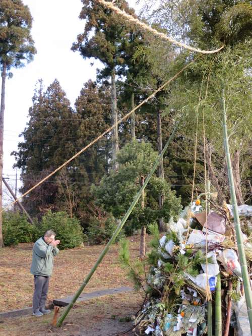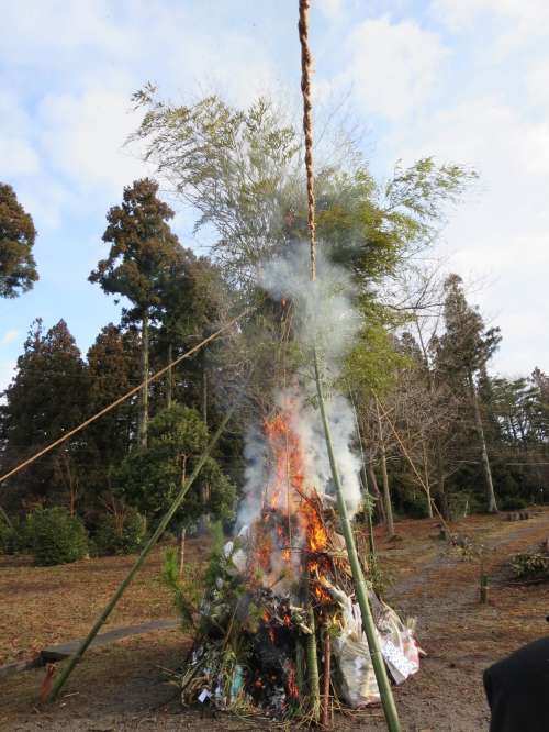 お正月お迎えした神様を、竹櫓やしめ縄飾りなどを燃やす炎でお送りします。 竹が爆ぜる音を響かせながら、見(jiàn)事に燃え上がりました。