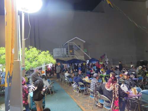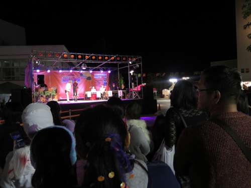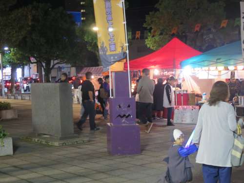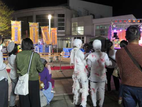 夜、森林住宅住宅地から自宅へ帰る道で、霧島市役所の広場前でもイベントが開催され車が渋滯するほど多くの方が遊びに來られていました。この會場でも「お化けの仮裝大會」が行われてました。霧島市の中重市長も審査員の一人として參加され仮裝大會は盛り上がっていました。また、會場內では多くの屋臺も出店されていて、多くの家族づれが來場されていました。