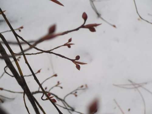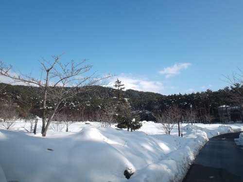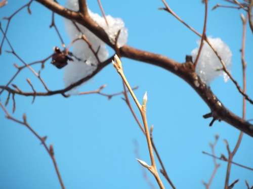 大成池公園の雪景色と青空 ウェルカムオフィスのナツツバキの冬芽。