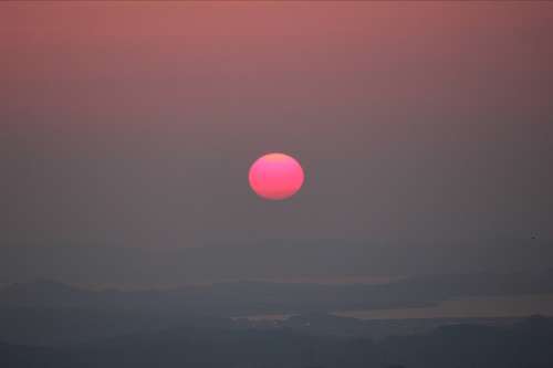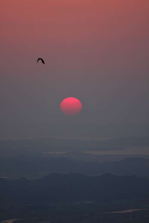 島根半島に消える直前の夕日。 手前に見える中海と奧にうっすらと見える宍道湖の湖面。