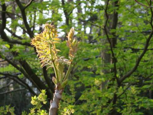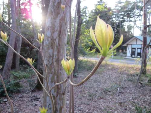 夕日を浴びてリョウブの新芽も淡く輝いているように。