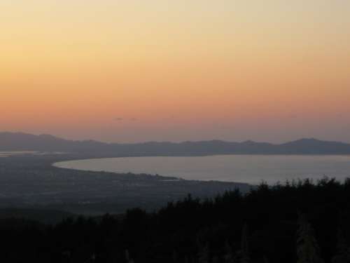 パイロットファームからは日本海や中海も見渡すことができ、光に反射して染まっている様子もまた綺麗です。 そしてうしろを振り返ると大山も夕日に少し染まり、いつもとは違った落ち著きを感じます。