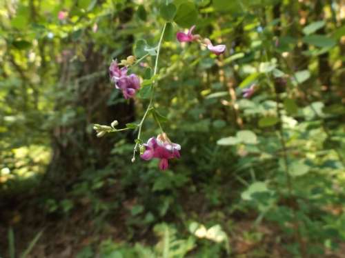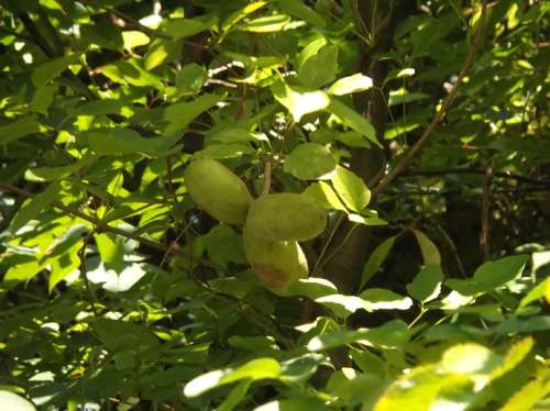 木々に隠れていますが注意して見てみるとアケビ。 いつのまにか立派な実を付けています。ちなみにコレはミツバアケビ。