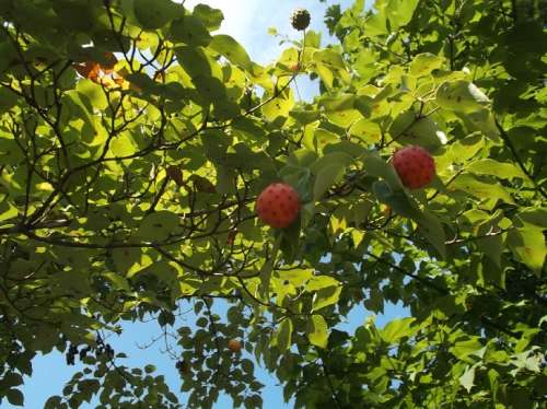 最後にウェルカムオフィス(現地案內所)の敷地にあるヤマボウシ。 ヤマボウシの実も色づき始めています。 少々奇妙な見た目ですが少し熟すと食べる事もできます。