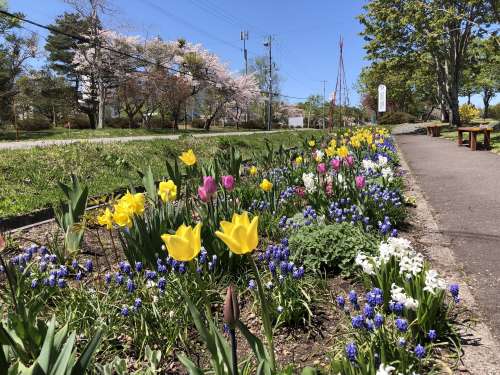 チューリップなどの花がとても綺麗ですね