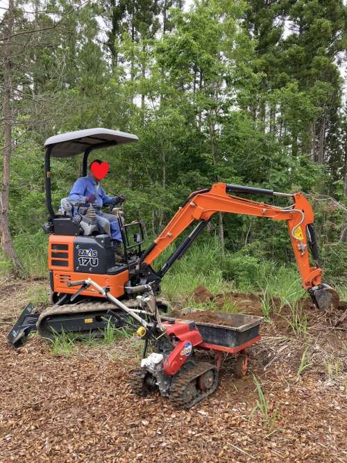 オーナー様がご所有のユンボでさっそうと登場していただきました