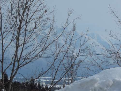 また、東の方に目を向けると雪化粧した川桁山の山並みを見ることができます。