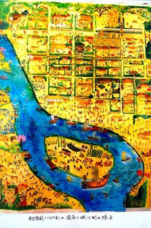 今から400年以上も前、薩摩藩と明國(14世紀~17世紀の中國)との貿易は盛んでした。他に琉球、朝鮮、アジア以外にもヨーロッパなど鉄砲やキリスト教の上陸地として、西洋にも開かれた玄関口を確保し、貿易によって巨萬の富をあげたとされます。その薩摩の貿易港の一つは、錦江灣の最奧に位置する霧島市國分にもありました。當時、島津氏が進めていた海外貿易の港灣の一部として、琉球や中國をはじめとする貿易船が、錦江灣から遡上してきていたということから、かなりの川幅があったことが窺えます。錦江灣へ迫りだした巨大な河川から入ってきた渡來船は、様々な人や物資をこの地まで運び、また異國へ運ばれていきました。舞鶴城の城下町、その賑わいは國際色豊かなことだったでしょう。