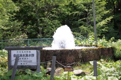 さて、金沢清水までのアクセスです。八幡平溫泉郷の入り口近く、八幡平トラウトガーデンを目標にしてください。ガーデンは、子供から大人までが、ニジマスやイワナの釣りが楽しめ、ゴーカート、アーチェリーで遊ぶことができる娯楽施設です。これを左手に見ながら200メートルほど進むと、正面に、ヒメマス、サケ、イワナ、ニジマス、アユなどを飼育?研究している巖手県內水面水産技術センターがあります。金沢清水の湧水口は、センター右手の山際ですが、すぐ目に付くのが大量の水が噴水のように湧きだしている光景です。環(huán)境庁お墨付きの看板がありますが、その量たるや圧倒されます。
