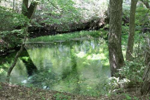 複雑に枝がからみあったブナやミズナラの樹々を縫って奧の階段を100メートルほど登ると、湧きだし元の池があります。中は立ち入り禁止ですが、展望臺から湧き出ている様子が一望できます。澄みきった水面に映る新緑の美しさ、水の湧きだす波紋を眺めていると神秘的な気さえしてきます。