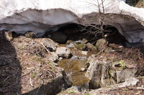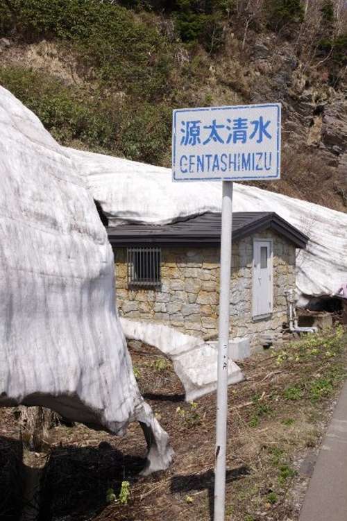 今回の取材の日は、まだまだ回廊の雪が完全に融けきっていないため、ほとんどが殘雪に覆われ清水の湧出の様子をご紹介できませんでしたが、崖からこんこんと湧き出る清水の量はかなりと言われています。