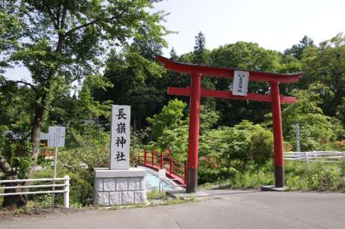駐車場の真ん前に、長嶺神社の碑が立ち、朱塗りの大鳥居が迎えてくれます。清流を下に見ながら太鼓橋を渡ると、手を加えられたサツキなどが立ち並び、綺麗に花を咲かせていました。